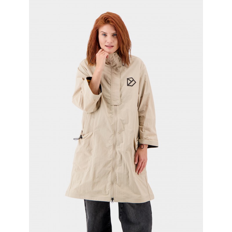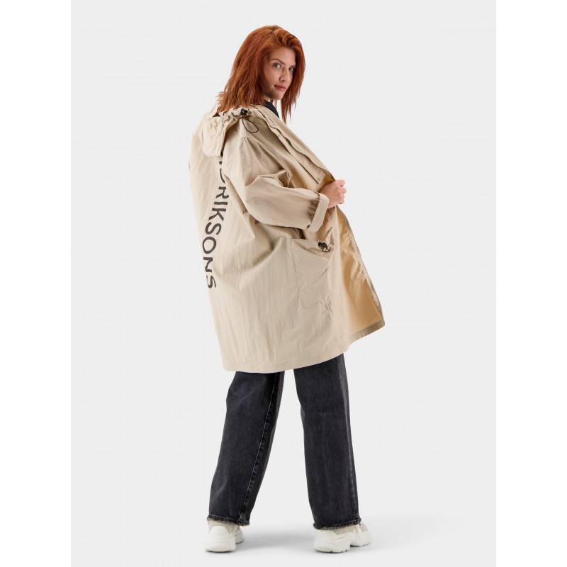 Juno er en let og moderne parka. Ærmernes bredde kan justeres ved hjælp af knapper, og designet inkluderer en fast hætte. Denne parka har dropped shoulders, poselommer og et logo påtrykt på ryggen. To lommer med snorejusteringer. Fremstillet af 55 % genvundet polyamid med en finish, der har crinkle-effekt.
