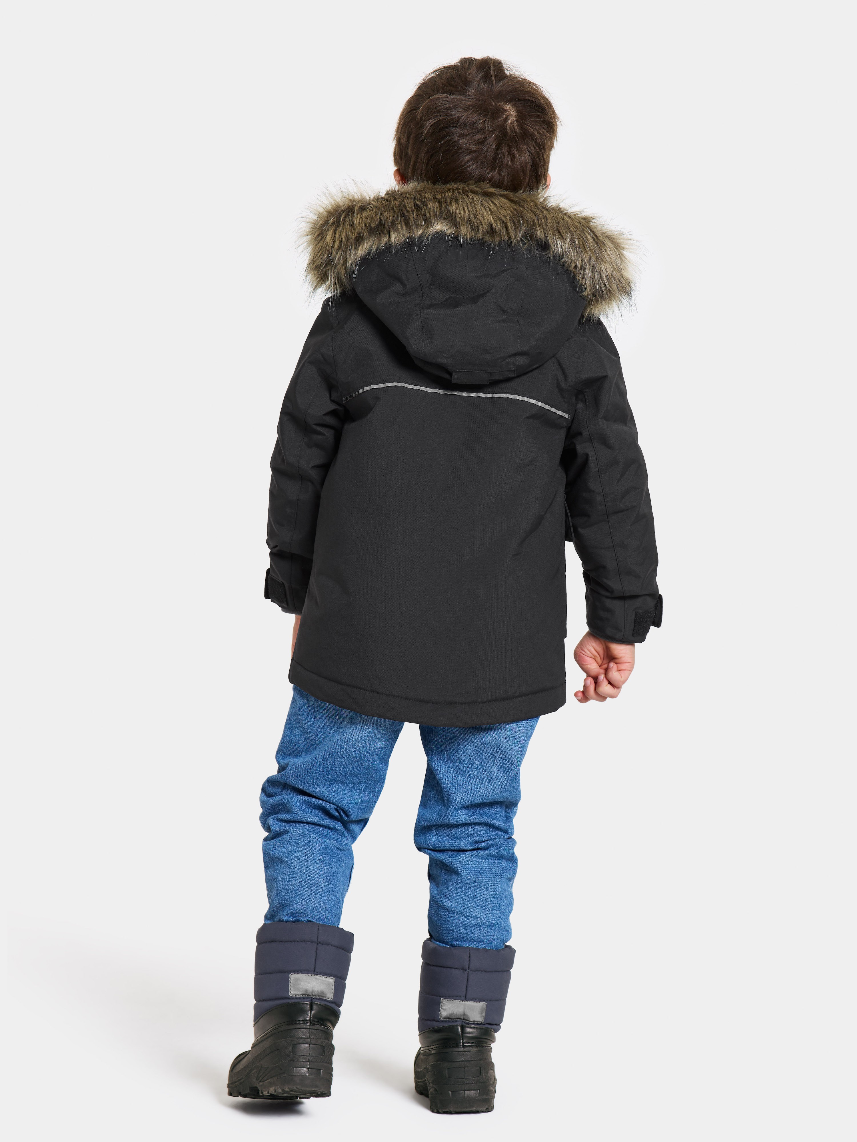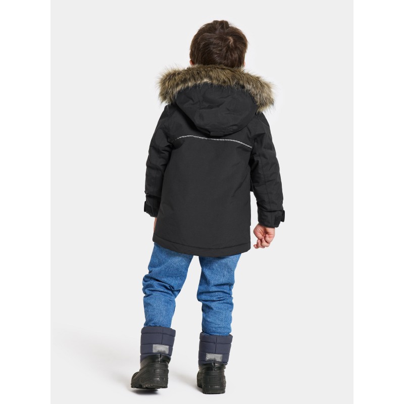 Den svejsede lomme er fremstillet af et refleksmateriale. Kure har to forlommer med løkke til fastgørelse af en refleks under lommeklappen. Hætten og dens syntetiske pelskant kan begge tages af. Kure er forsynet med "Extend size"-funktionen, hvilket betyder, at ærmerne kan forlænges med op til én størrelse. Kure er vatteret med genbrugsfiber af polyester, der giver en effektiv isolering.