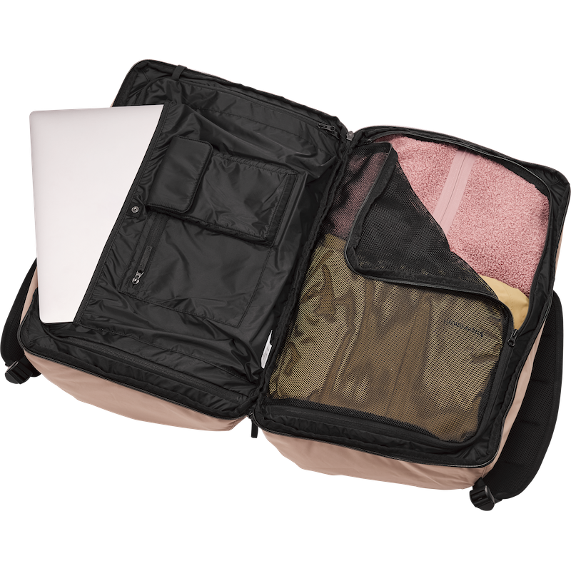 Indvendigt er der to store rum, et i mesh og et i foring, samt to indvendige lommer, en med lynlås og en med velcro. Der er også en indvendig lomme til en bærbar computer, der passer til et RAMSVIK laptop sleeve. Tasken har en praktisk nøglestrop og en frontlomme med lynlås til ekstra opbevaring.