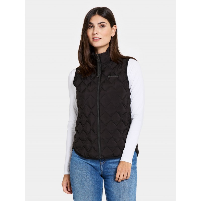 Evy er en let og varm vest, der kombinerer funktion og stil til hverdagsbrug. Den er lavet af et blødt og behageligt materiale med elastiske kanter omkring ærmegabene og kanten for en behagelig pasform. Vesten har en opretstående krave, der giver ekstra varme og beskyttelse, samt en praktisk frontlynlås. Med både indvendige og udvendige lommer, der lukkes med knapper, tilbyder Evy masser af opbevaringsmuligheder.