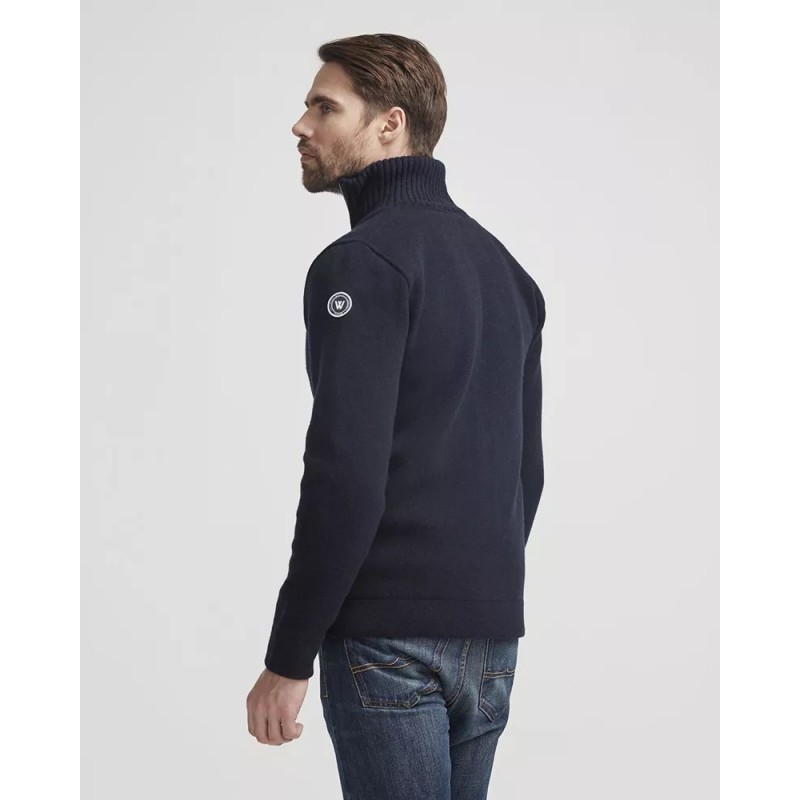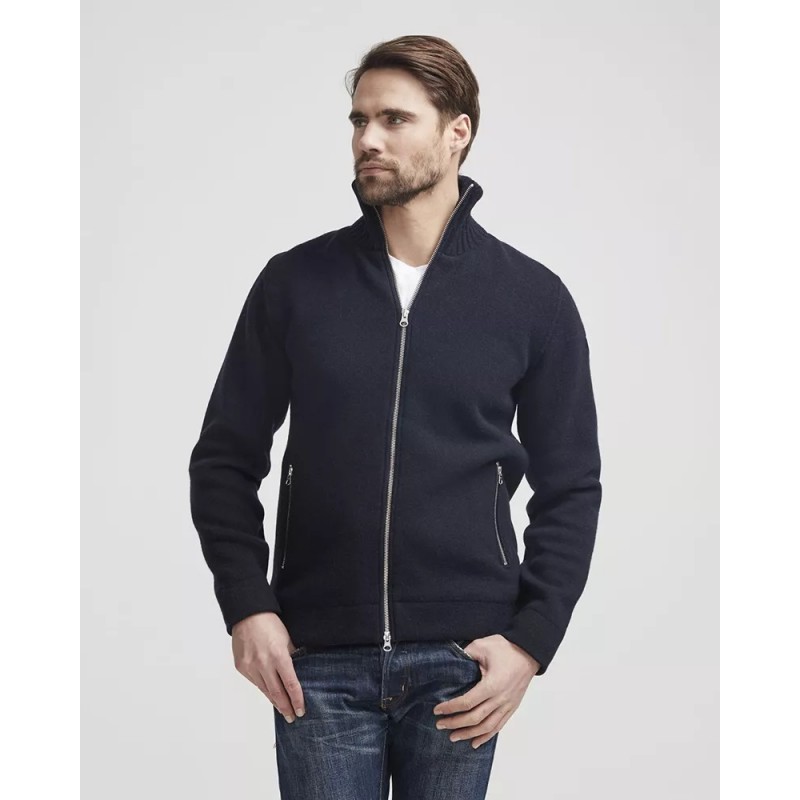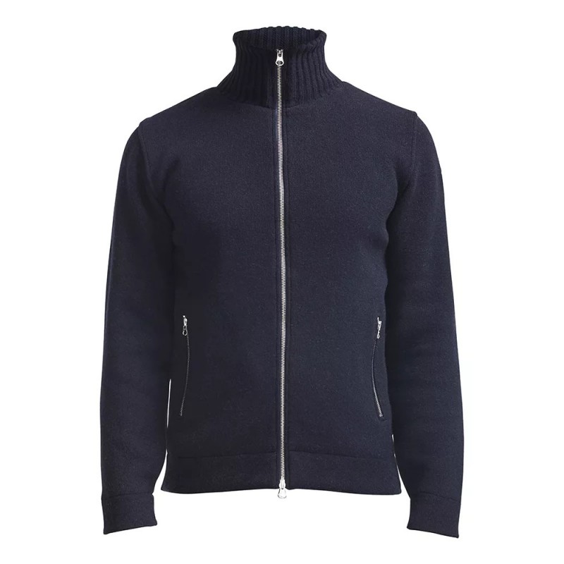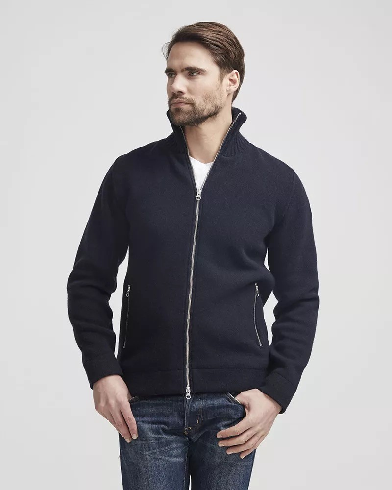 Vindafvisende, strikket sweater i uldblanding. Tovejslynlås og lynlåslommer. Høj ribstrikket krave med strikket bomuld på indersiden for ekstra komfort. Regulær pasform. Bæredygtigt produceret i Europa.