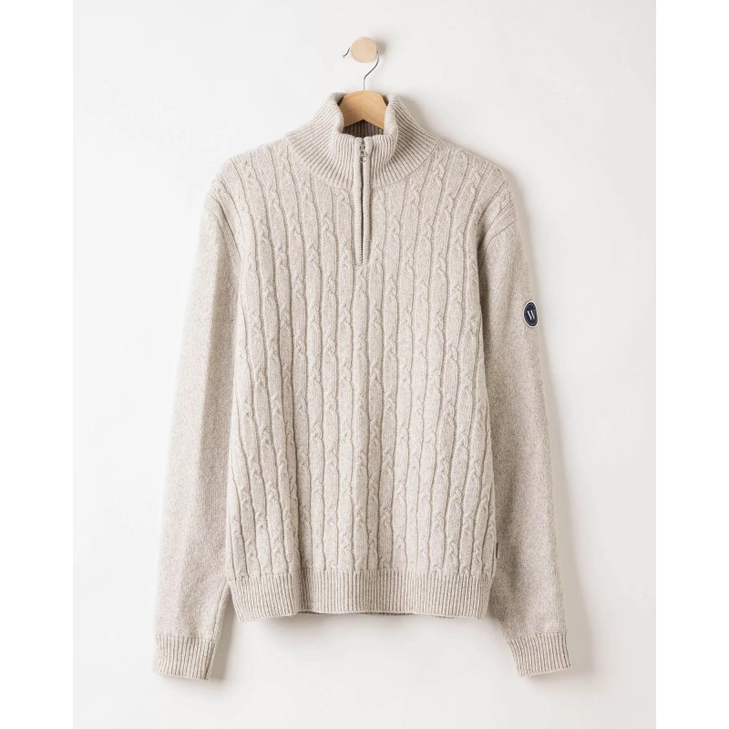 Vindafvisende, strikket sweater i merinould og kashmir. Kabelstrikket front. Høj ribstrikket krave med lynlås. Regulær pasform med ribstrikkede manchetter. Bæredygtigt produceret i Europa.