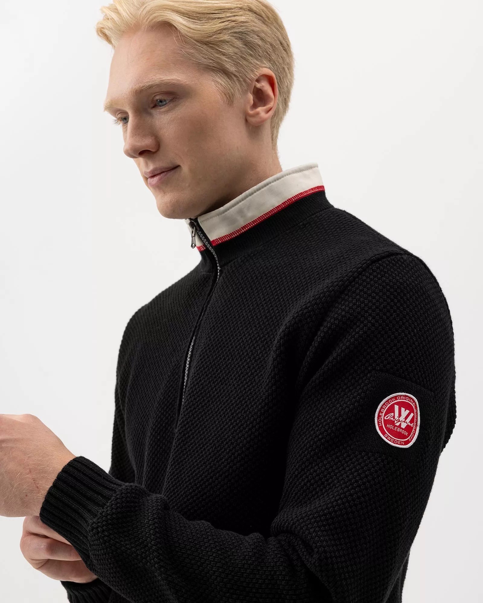 Vindafvisende, strikket sweater i bomuld. Strukturstrik med vævede detaljer ved kraven. Kort lynlås og regulær til rummelig pasform. Ribstrikkede manchetter. Bæredygtigt produceret i Europa.