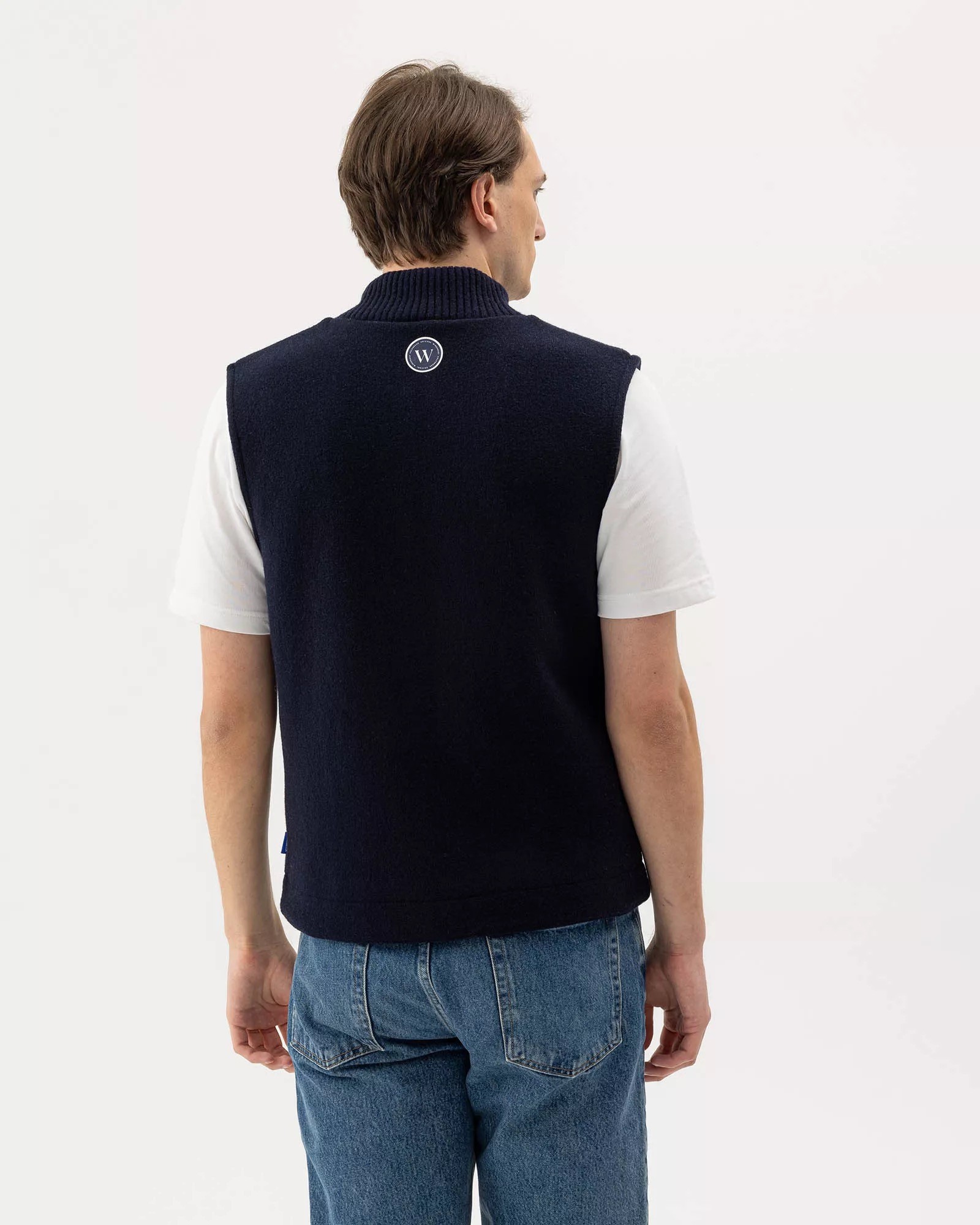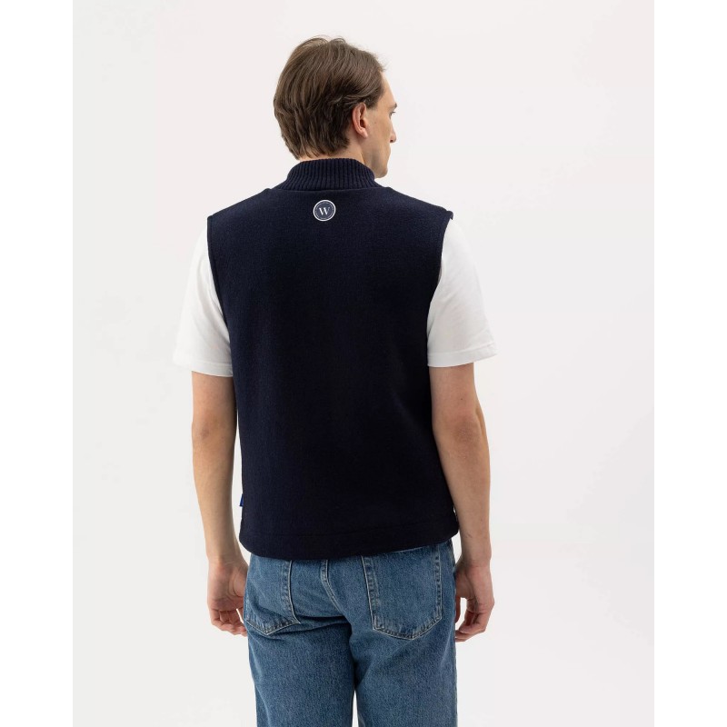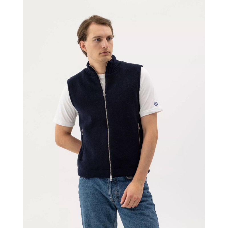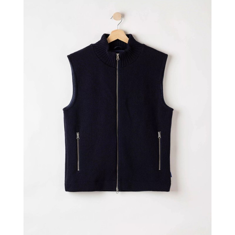 Strikket vindtæt vest i uldblanding. Kraftig tovejslynlås og lommer med lynlås. Høj ribstrikket krave med strikket bomuld på indersiden for ekstra komfort. Strikket i doubleface. Normal pasform. Bæredygtigt produceret i Europa.