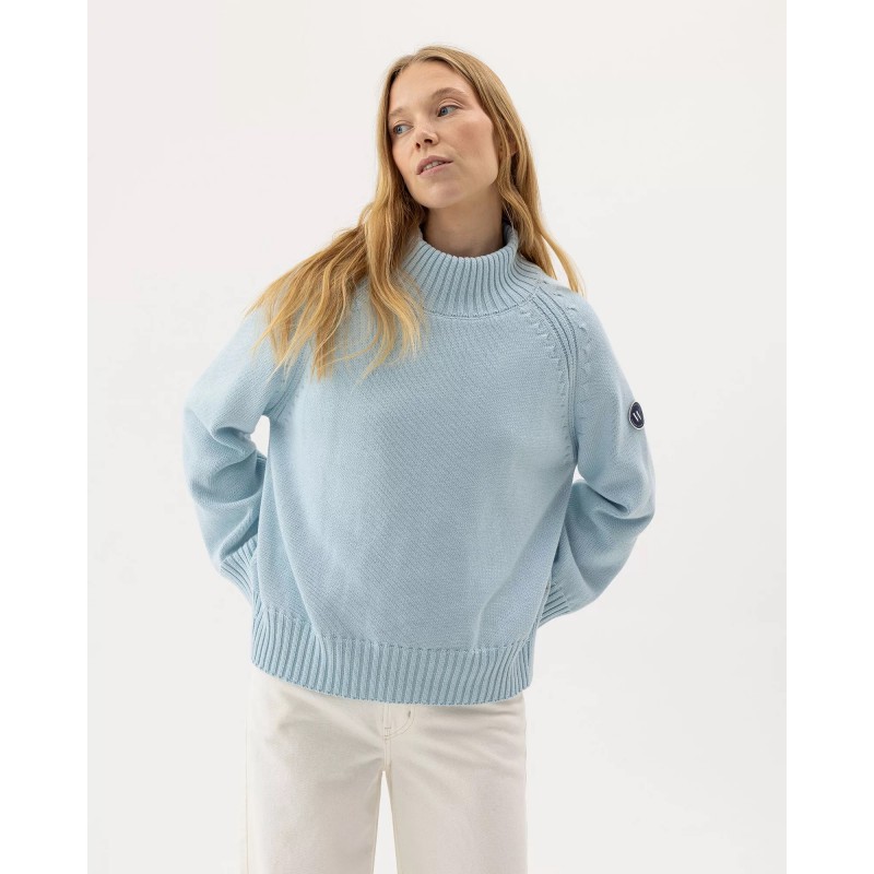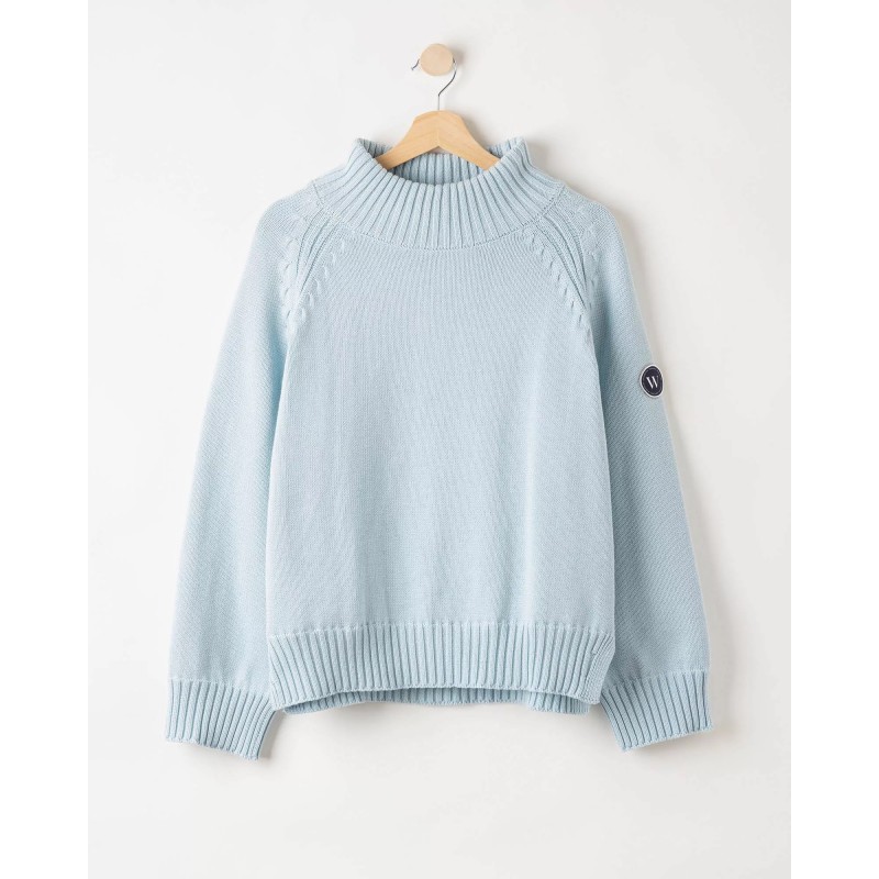 Vindafvisende, strikket rullekrave i økologisk bomuld. Afslappet pasform med raglanærmer og fuldt designede detaljer. Ribstrikkede kanter. Bæredygtigt produceret i Europa.