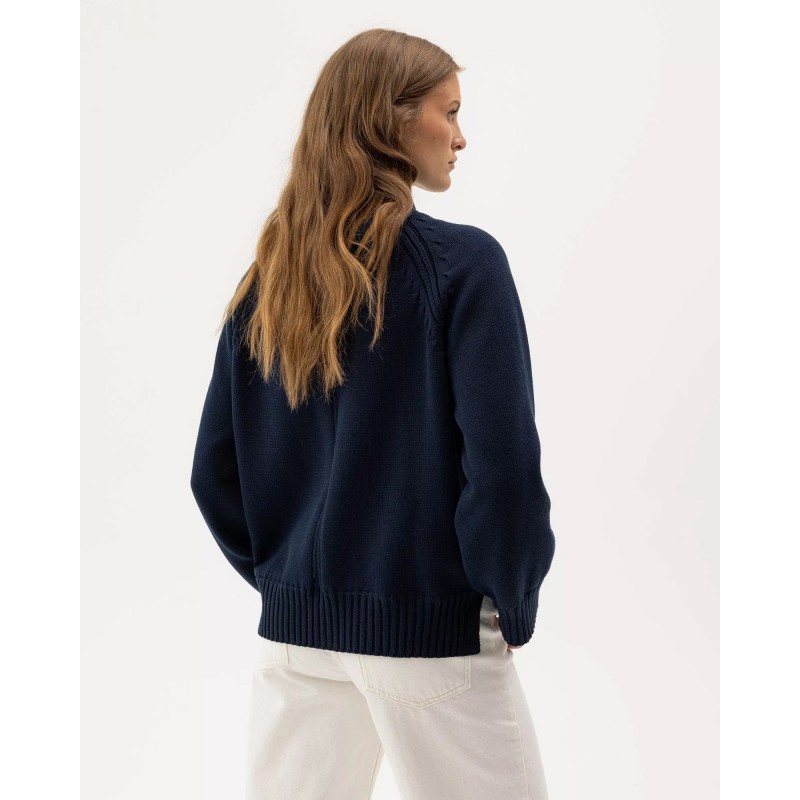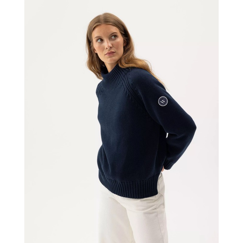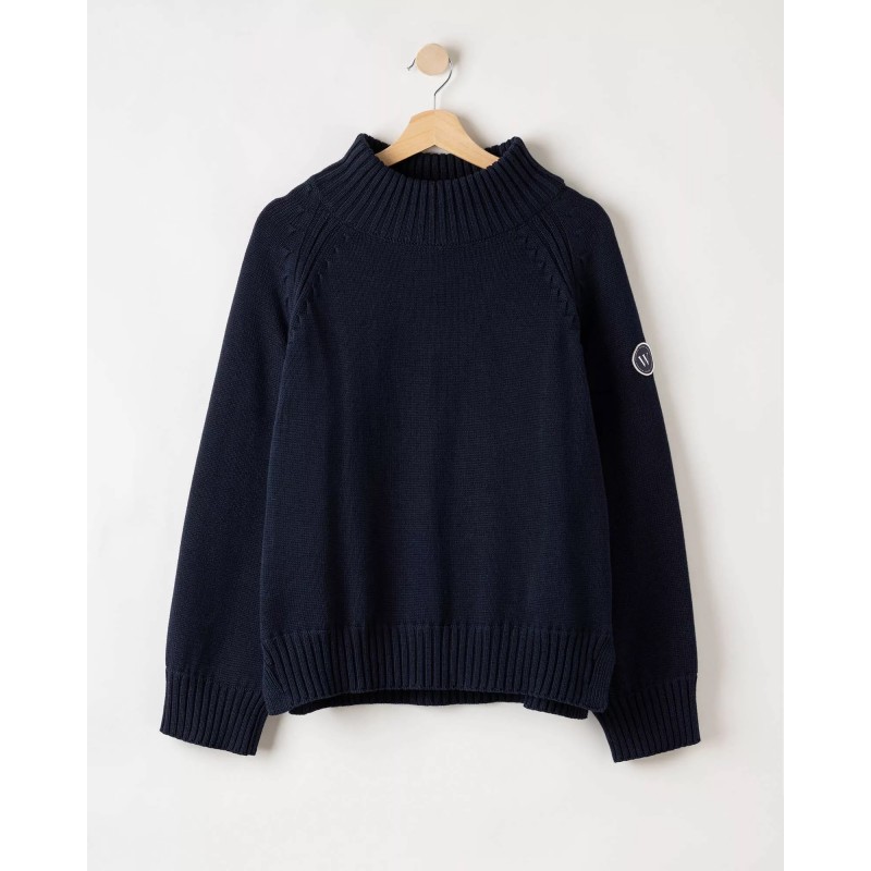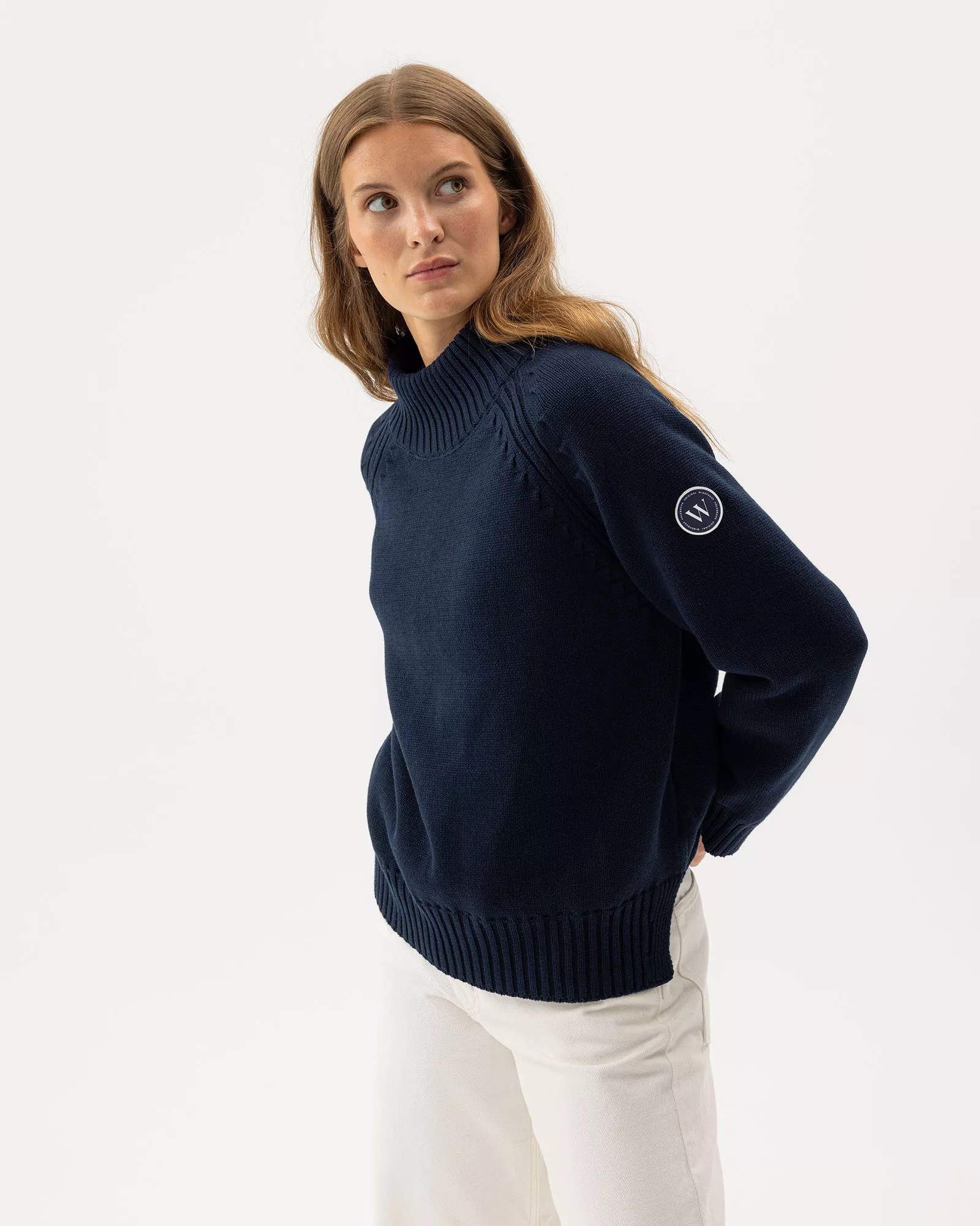 Vindafvisende, strikket rullekrave i økologisk bomuld. Afslappet pasform med raglanærmer og fuldt designede detaljer. Ribstrikkede kanter. Bæredygtigt produceret i Europa.