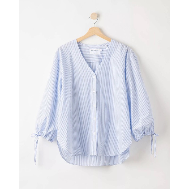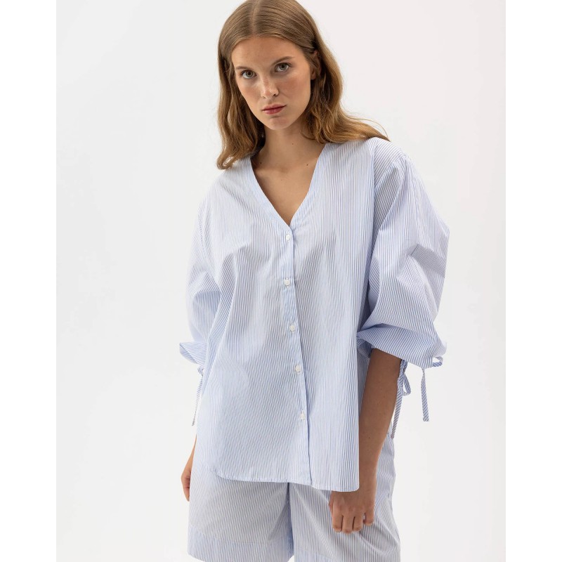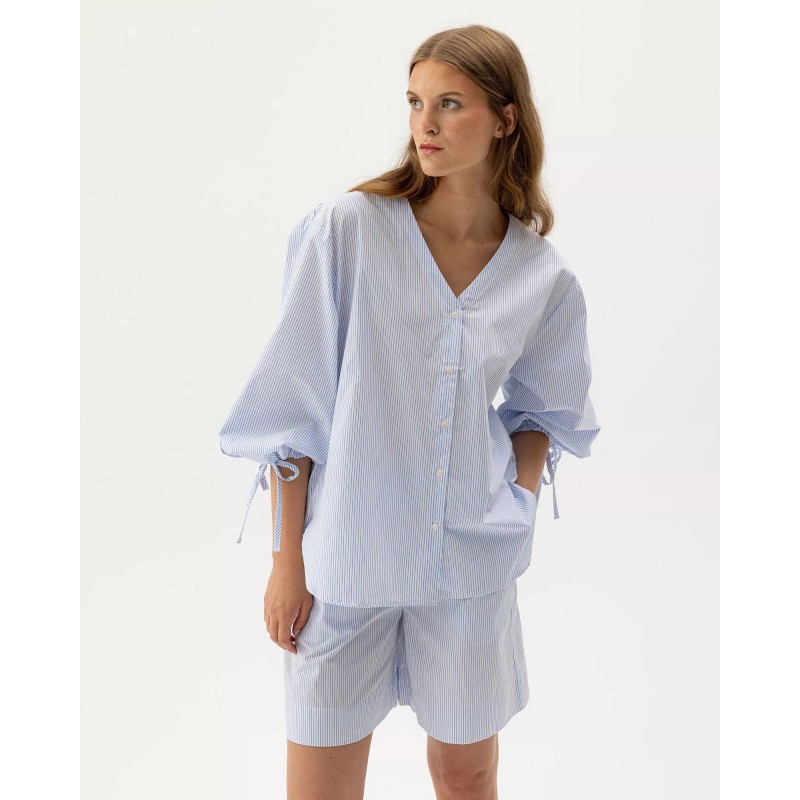 Skjorte i sprød bomuldspoplin. Afslappet pasform. V-hals med knapper foran. Brede ærmer, der kan justeres med en snøre. Bærestykke med lægdetalje bagpå. Kombinér med Marie Shorts, Marie Bukser eller Marie Nederdel for et matchende sæt. Bæredygtigt produceret i Europa.