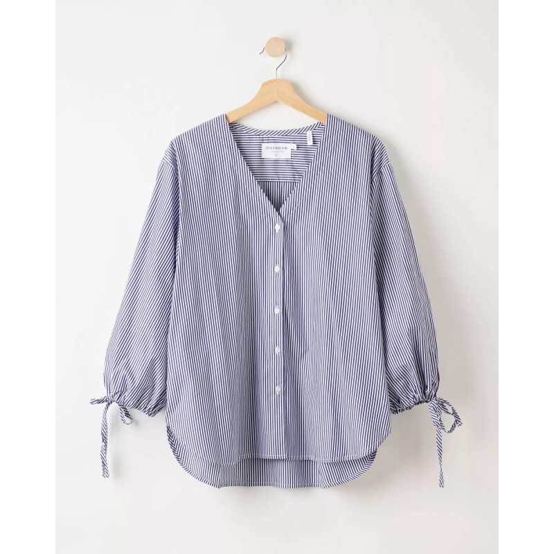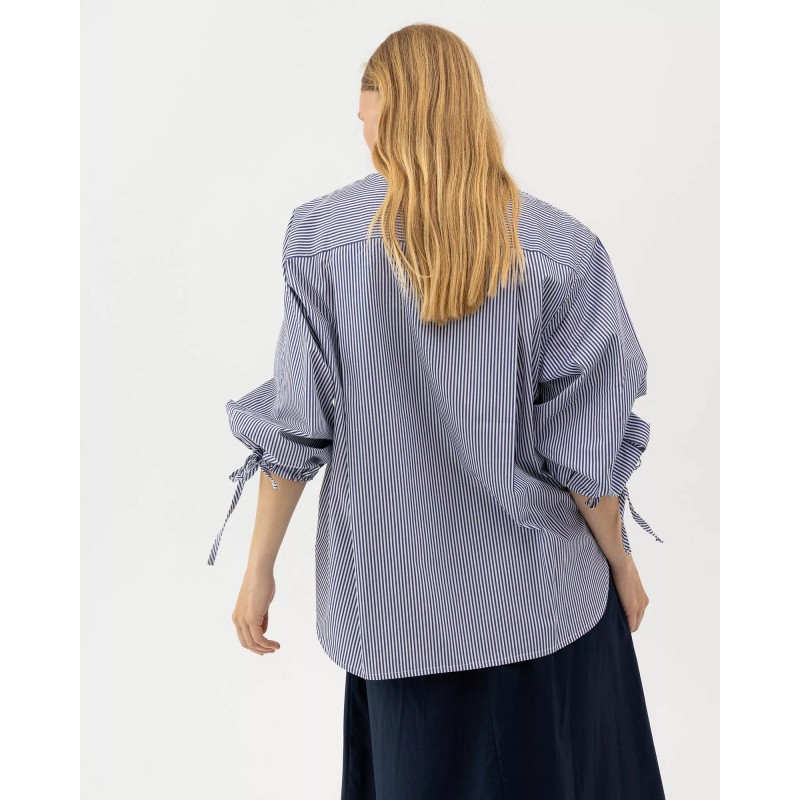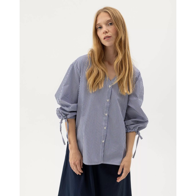Skjorte i sprød bomuldspoplin. Afslappet pasform. V-hals med knapper foran. Brede ærmer, der kan justeres med en snøre. Bærestykke med lægdetalje bagpå. Kombinér med Marie Shorts, Marie Bukser eller Marie Nederdel for et matchende sæt. Bæredygtigt produceret i Europa.