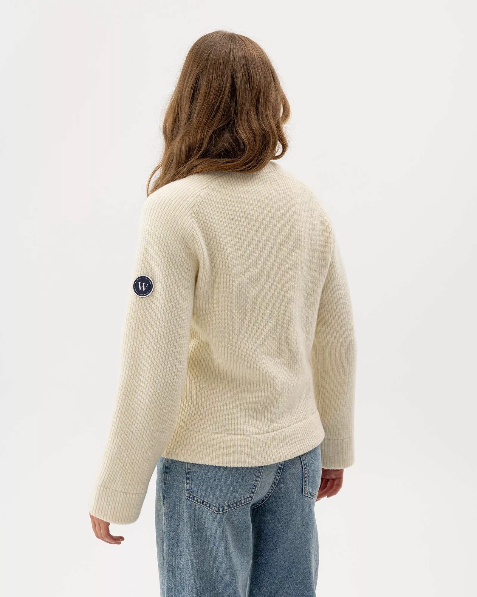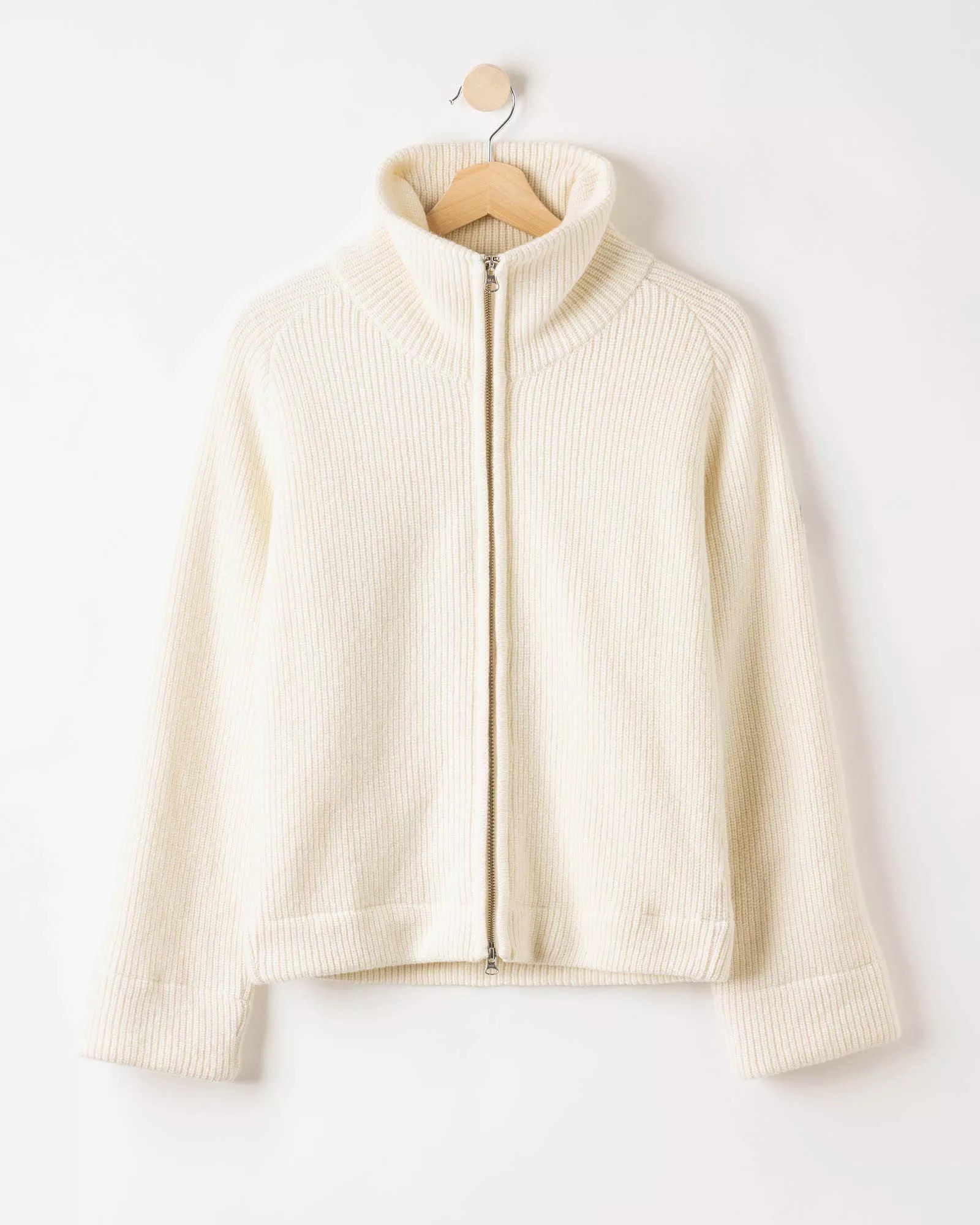 Vind- stopper strik trøje i blød uldblanding. Patentstrikket med kraftig tovejslynlås foran. Normal pasform med høj krave. Bæredygtigt produceret i Europa.