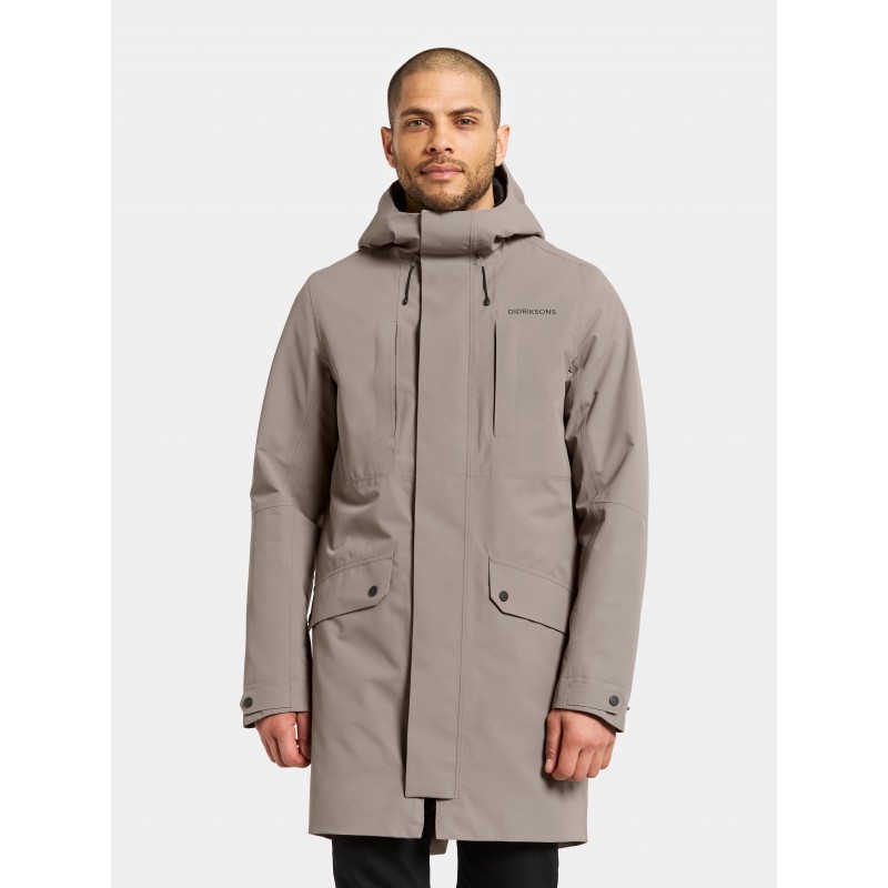 Den faste hætte kan justeres i to retninger og har en formet skygge for ekstra beskyttelse mod regn. Parkaen har flere praktiske lommer, herunder en inderlomme med lynlås og en brystlomme med lynlås, samt forlommer med knapper. Manchetterne kan justeres med knapper for en perfekt pasform. Lynlåsen ligger aldrig direkte mod hagen takket være kragens design, hvilket øger komforten.