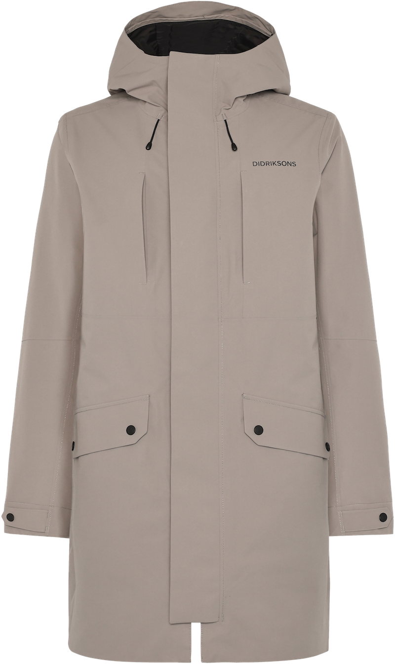 Falke er en klassisk beskyttende parka til mænd, perfekt til både hverdagsbrug og udendørsaktiviteter. Den er vand- og vindtæt med tapede sømme og lavet af et åndbart materiale, hvilket gør den ideel til alle vejrforhold. Parkaen har en lige pasform og er udstyret med en tovejs lynlås foran, hvilket giver ekstra fleksibilitet og komfort.