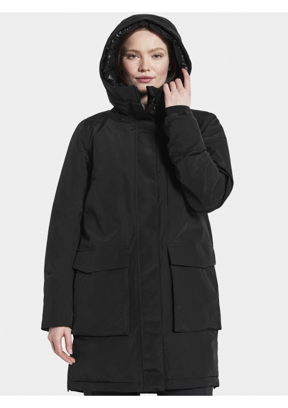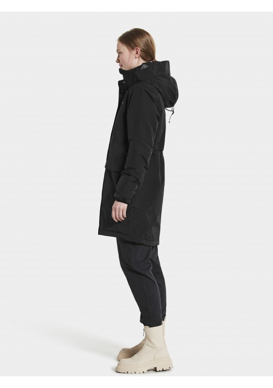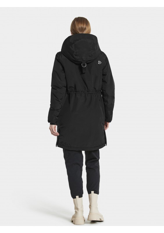 Leya er en polstret, sporty parka med mange funktionelle detaljer til hverdagsbrug. Den er fuldstændig vindtæt og vandtæt med tapede sømme og har en afslappet pasform med en lige silhuet. Taljen er justerbar og der er slidser i siderne for øget bevægelighed.